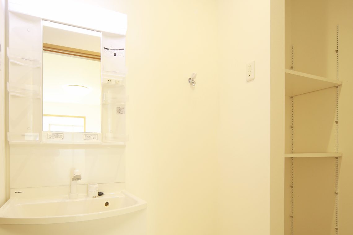 そして洗面所にはタオルや洗剤のストックなどをすっきり整頓できる、可動式棚を設置しました。