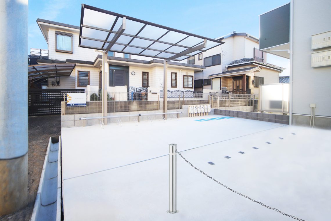 また敷地内への他車の侵入を防ぐため、ポールタイプの車止めを設置。出し入れが可能なポールに内蔵されているチェーンをひくだけで、手間をかけずに使用できます。