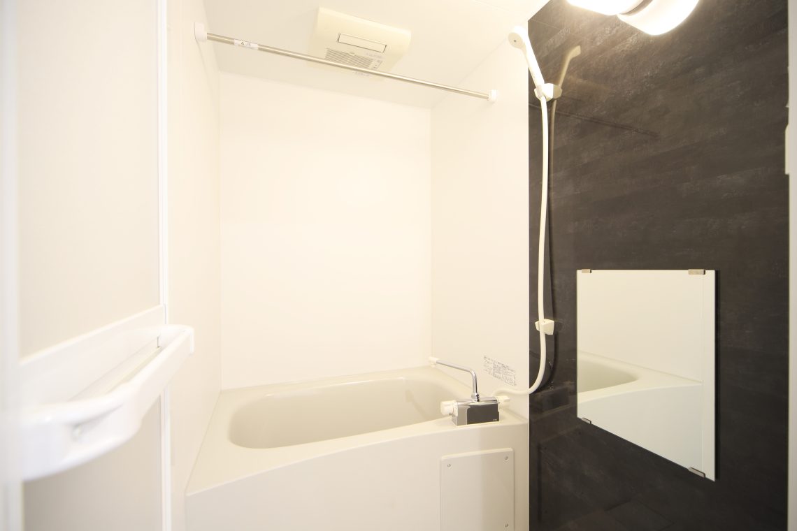 また清潔感のある白のなかにアンティークブラック柄のアクセントパネルを取り入れた浴室は、モノトーンな雰囲気で洗練された印象を与えてくれます。