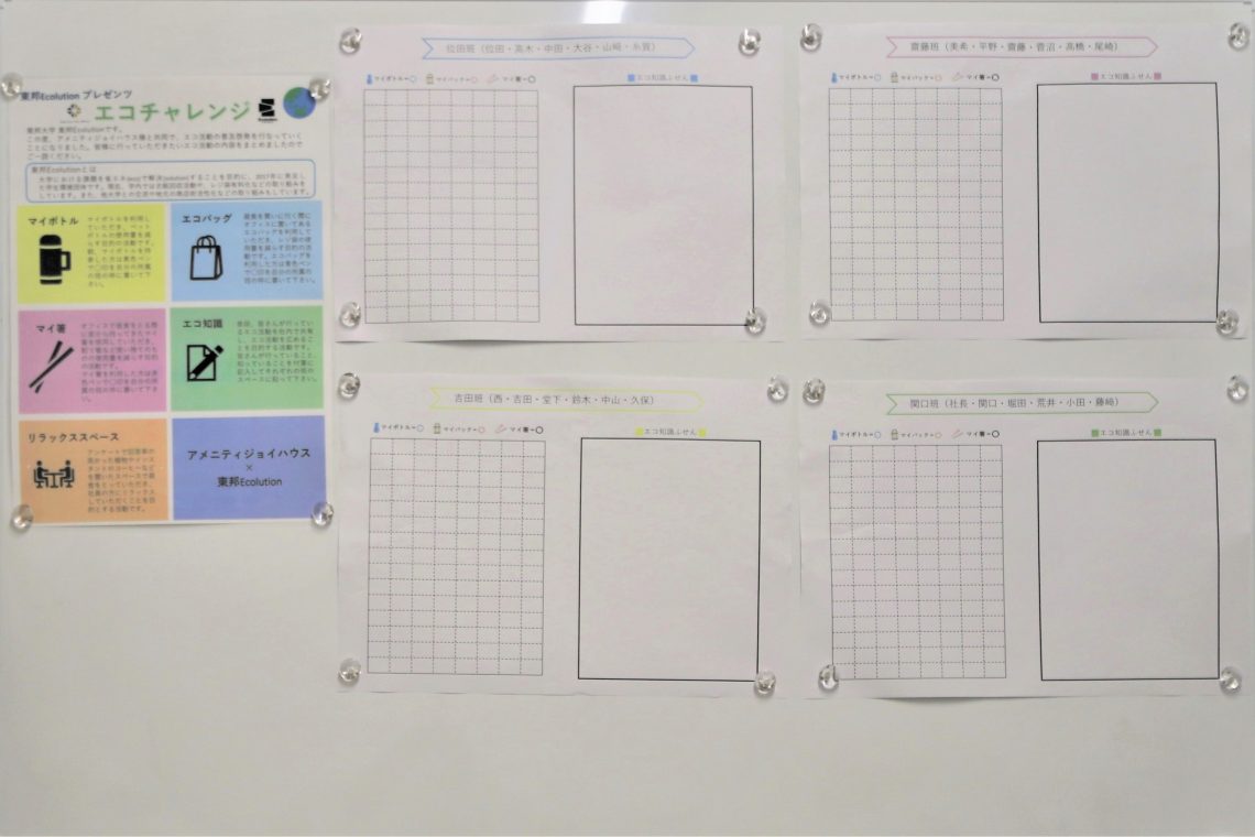 従業員を4班に分け学生達が企画したエコ活動に取り組むだけではなく、従業員も積極的にそれぞれのエコ知識を共有しあっています。この活動に取り組む中、改めてエコについて一人ひとりが意識するようになったと感じたとともに、このような検証を企画してくれた学生達に感謝の気持ちが溢れます。