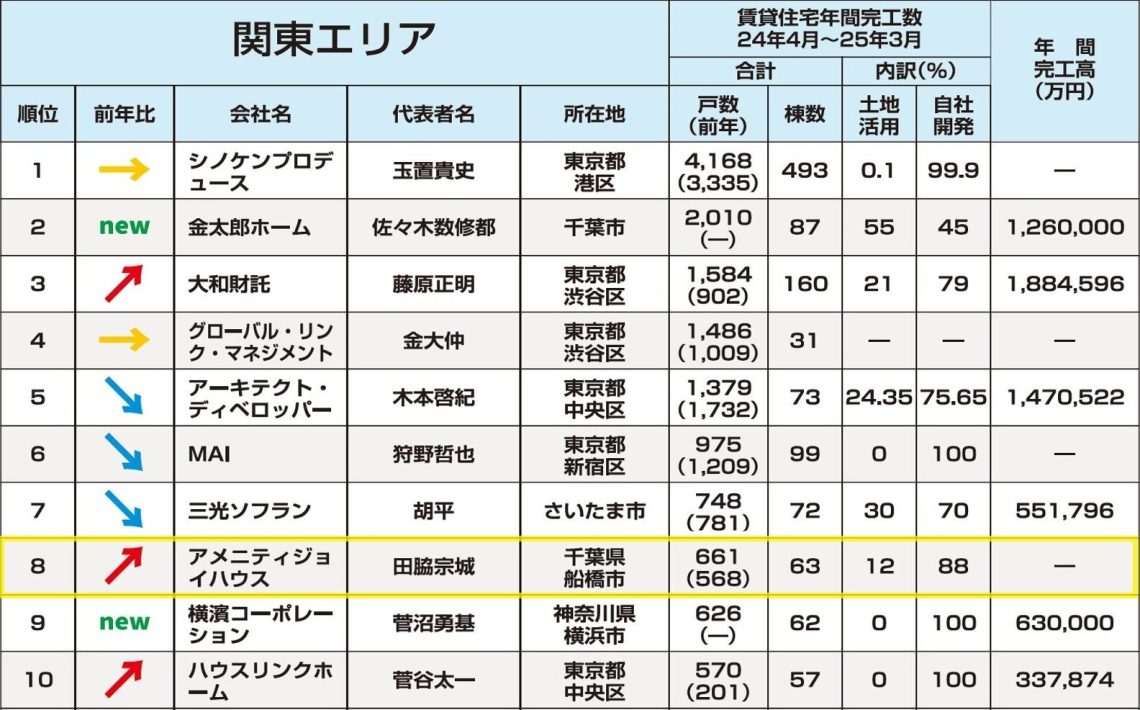 尚、アメニティジョイハウスのランキングは完工数661戸・63棟で、関東エリア8位となっております。
