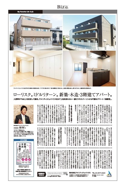 2018年1月26日㈮発行「ビズスタ東京版 1月特大号」(日本経済新聞 朝刊折込)で、当社が提案する「新築」「木造」「3階建て」アパートについて紹介しています。