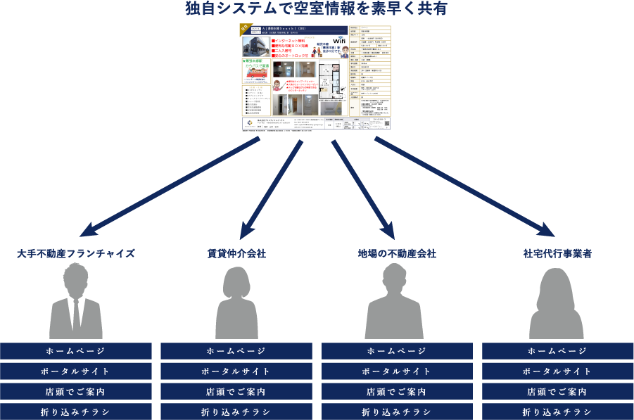 一般的に入居斡旋をする場合、自社ホームページ、ポータルサイトへの登録、店頭でのご案内、折り込みチラシによって入居者募集をしますが、AJプロパティでは、独自のネットワークをシステム化することによって高い稼働率を維持しています。