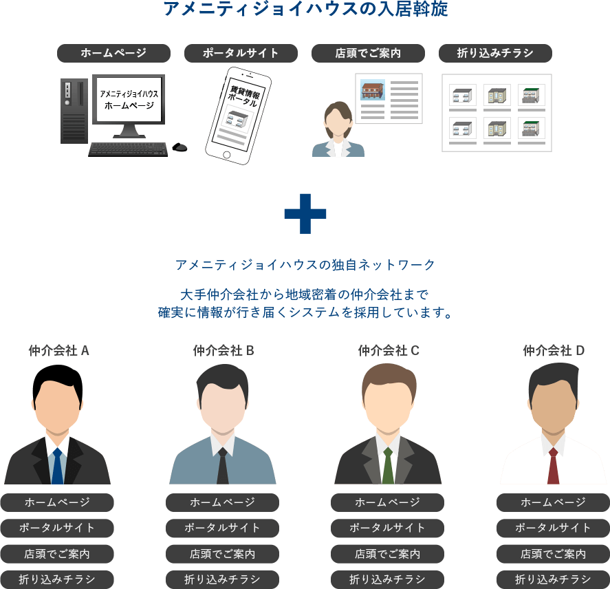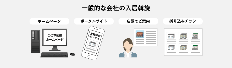 一般的に入居斡旋をする場合、自社ホームページ、ポータルサイトへの登録、店頭でのご案内、折り込みチラシによって入居者募集をしますが、AJプロパティでは、独自のネットワークをシステム化することによって高い稼働率を維持しています。