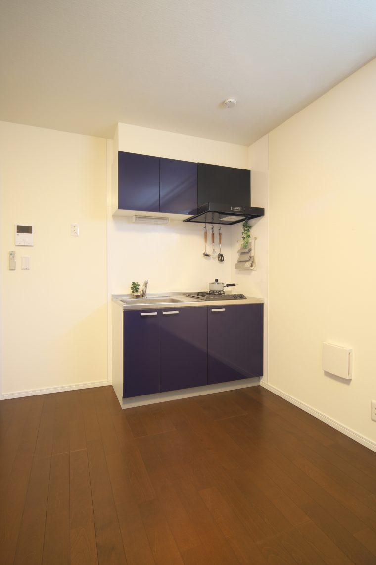 3階はウォールナット色の建具に、ブルーのキッチンを採用。