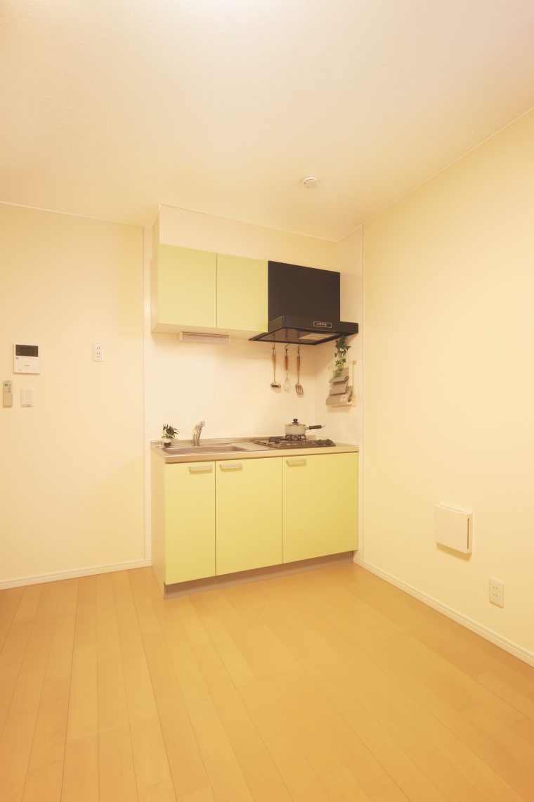 2階はメープル色の建具に、グリーンのキッチンを採用。