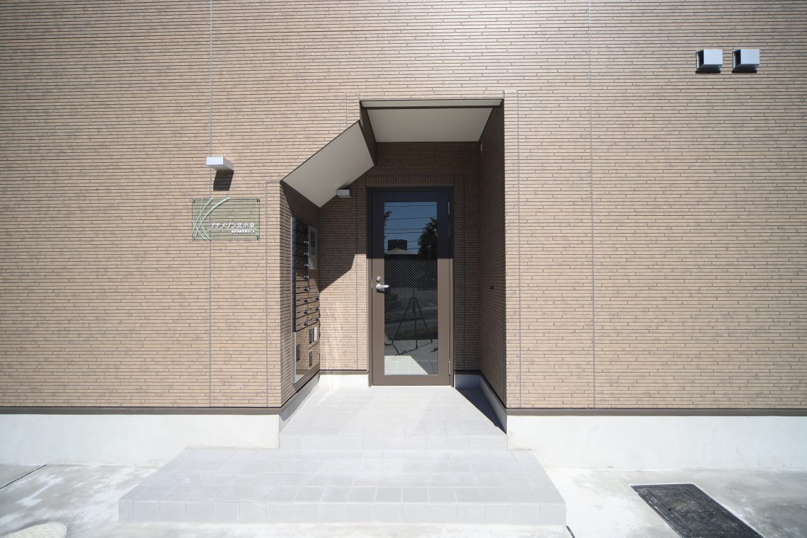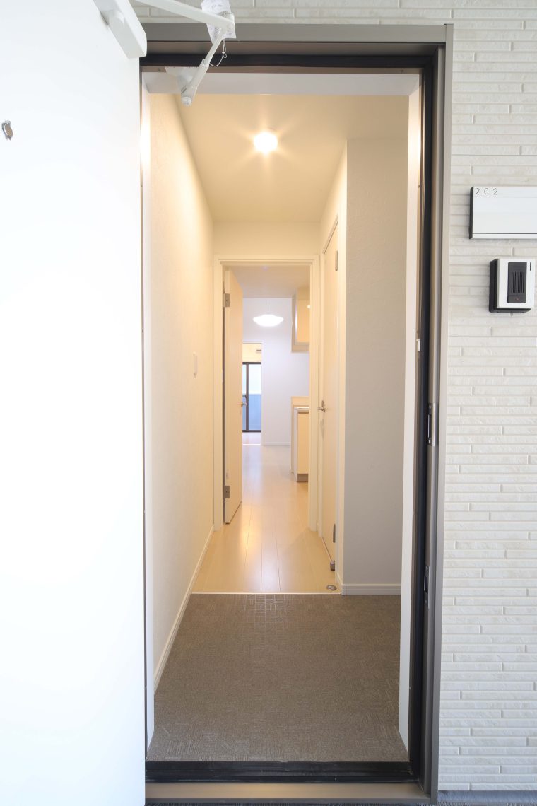エントランスから中へ入ると、ダークブラウンの扉が目に留まる内廊下へと続きます。